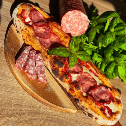 Sos z włoskich pomidorów, mozzarella fior di latte, salame napoli.